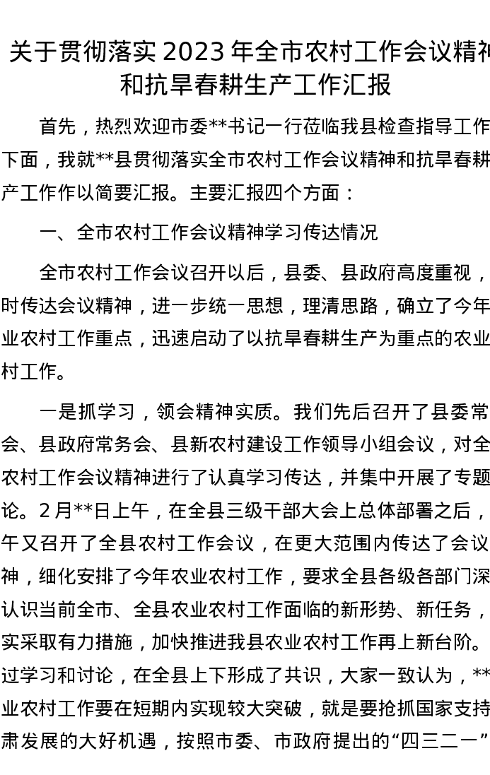 关于贯彻落实2023年全市农村工作会议精神和抗旱春耕生产工作汇报