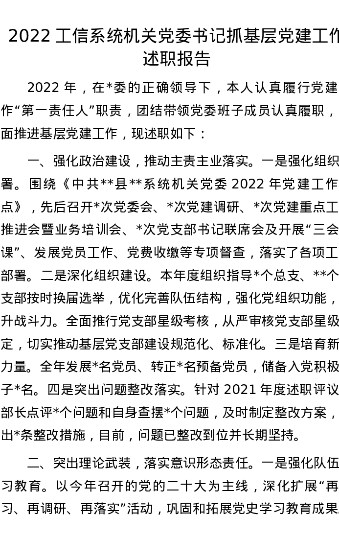 2022工信系统机关党委书记抓基层党建工作述职报告