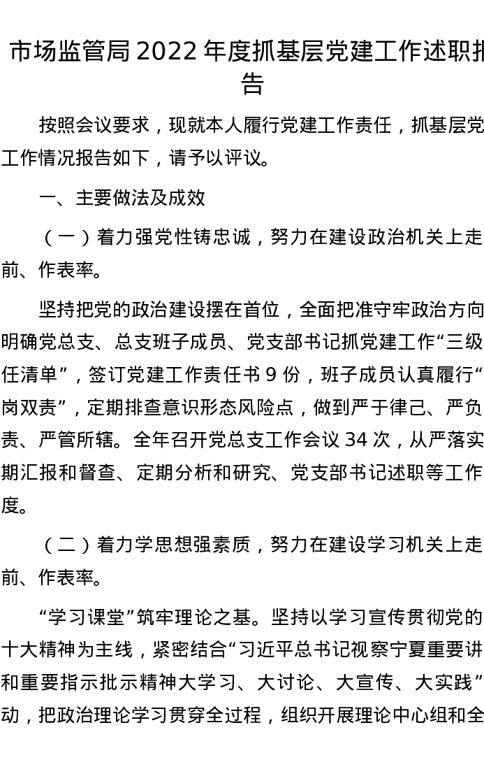 市场监管局2022年度抓基层党建工作述职报告