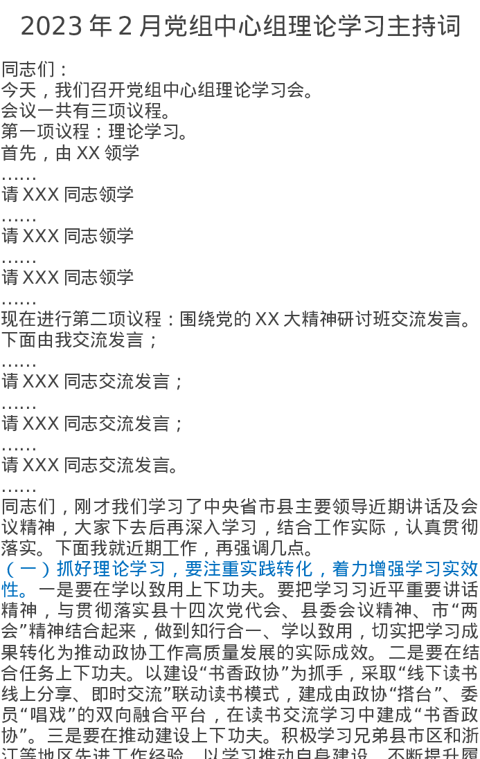 2023年2月党组中心组理论学习主持词