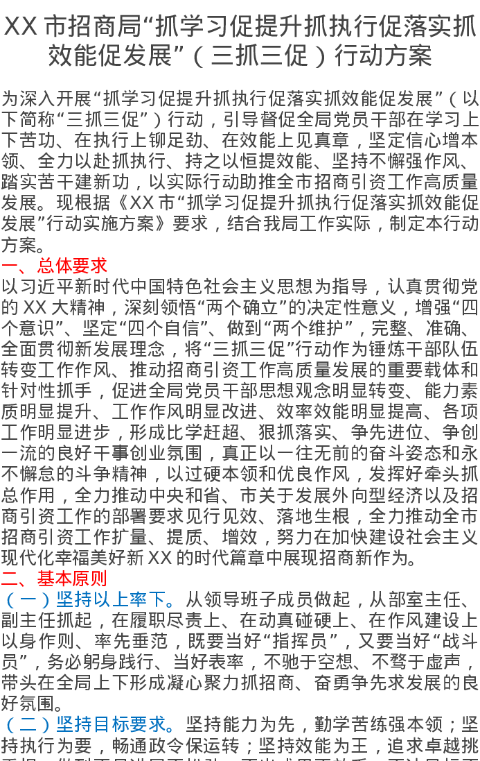 XX市招商局“抓学习促提升抓执行促落实抓效能促发展”(三抓三促)行动方案