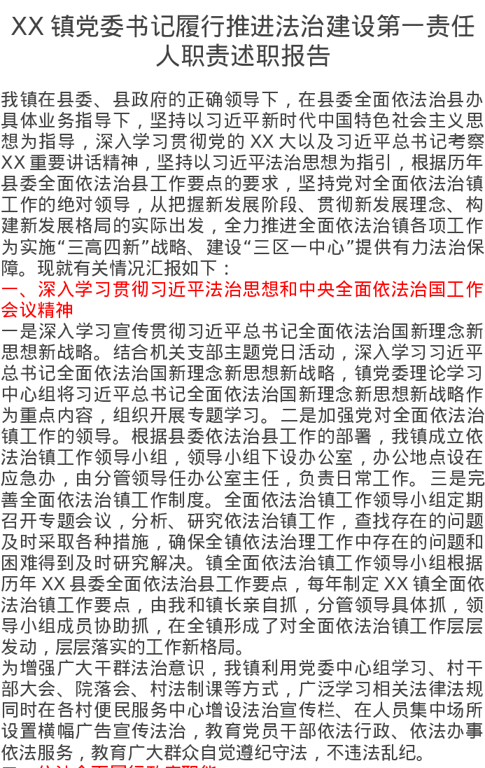 XX镇党委书记履行推进法治建设第一责任人职责述职报告