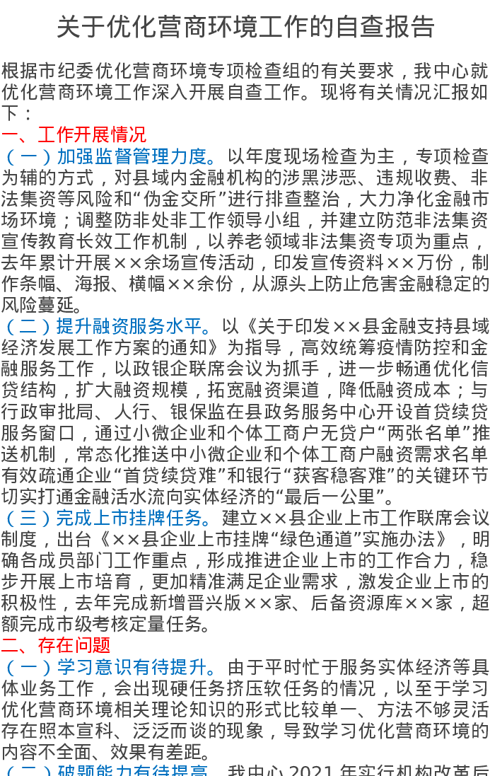关于优化营商环境工作的自查报告