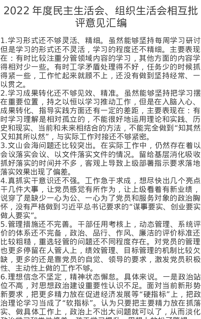 2022年度民主生活会、组织生活会相互批评意见汇编