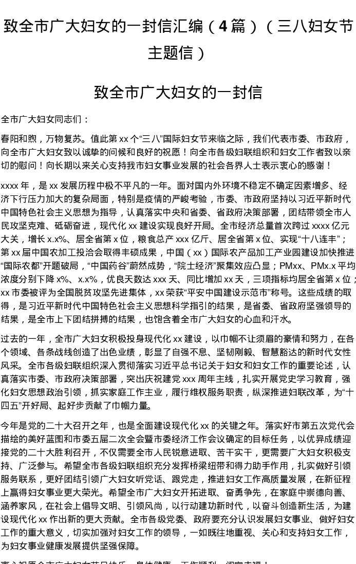 汇编:致全市广大妇女的一封信汇4篇(三八妇女节主题信)