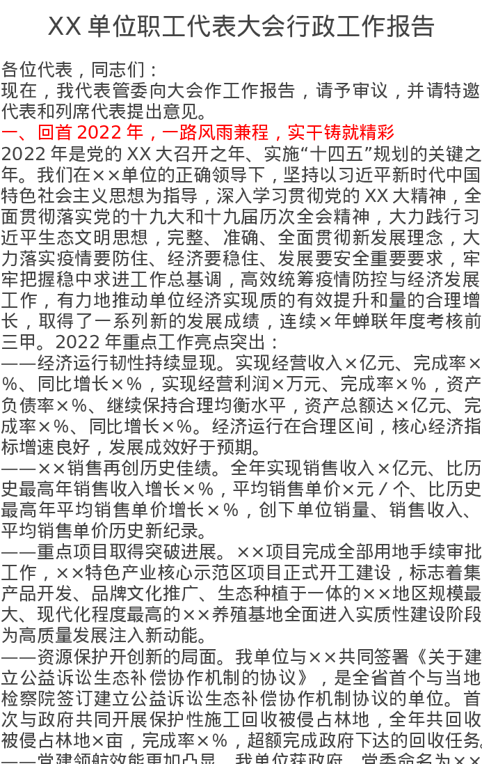 XX单位职工代表大会行政工作报告