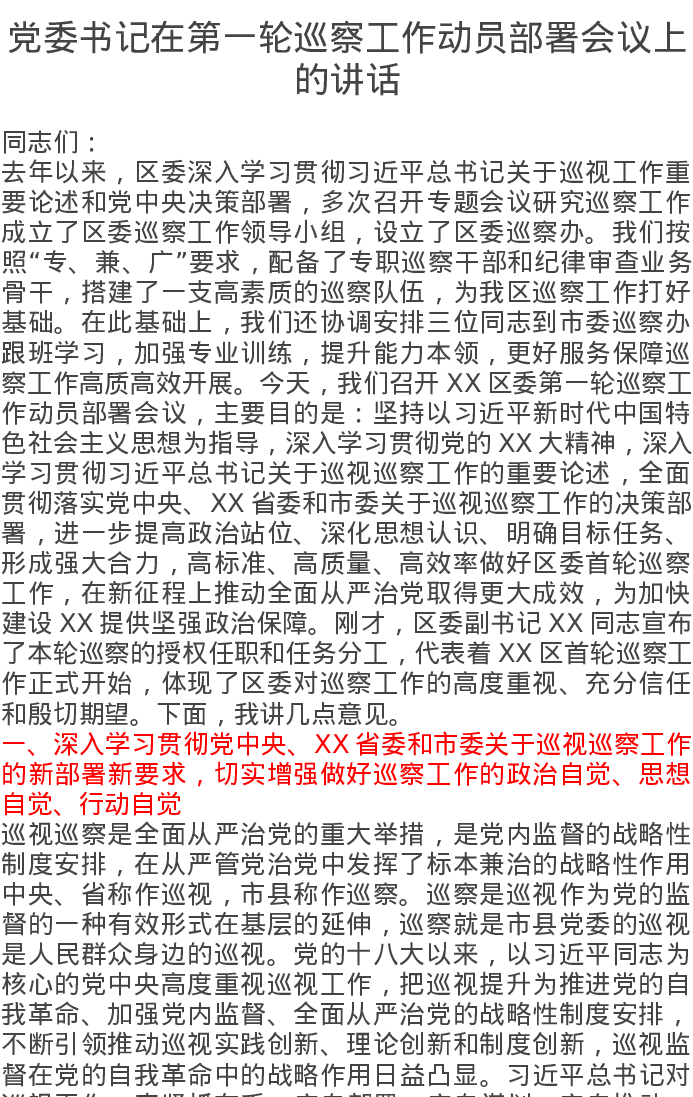 党委书记在第一轮巡察工作动员部署会议上的讲话