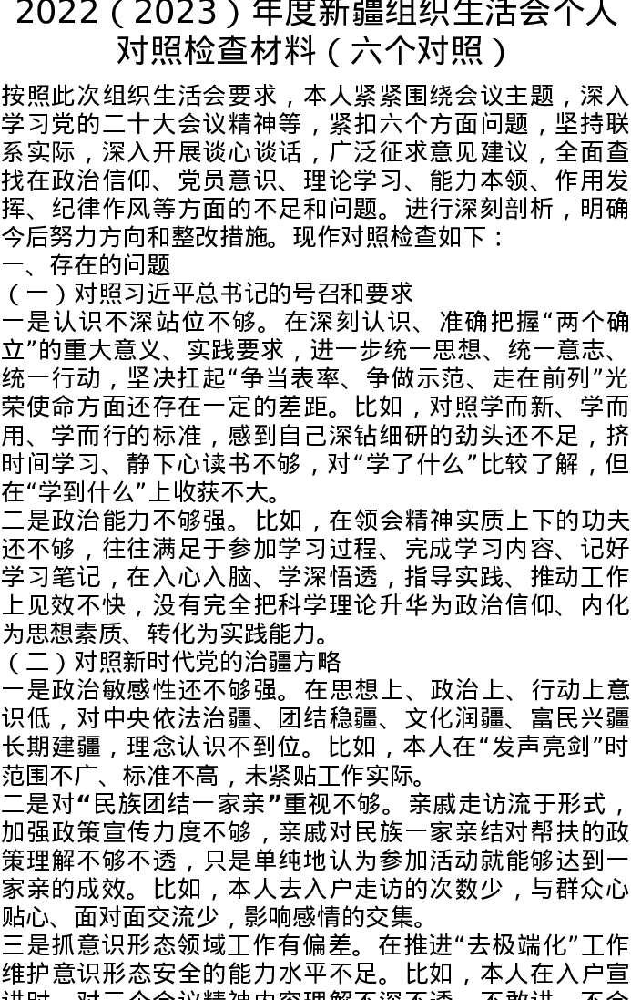 2022(2023)年度新疆组织生活会个人对照检查材料(六个对照)