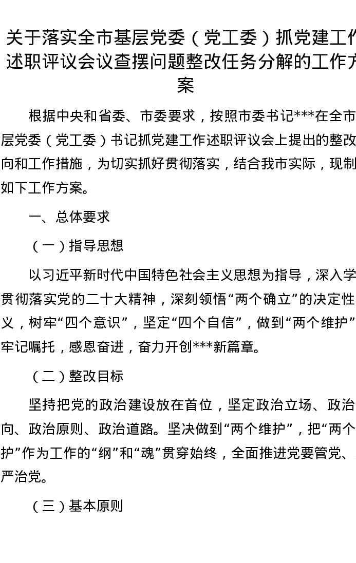 关于落实全市基层党委(党工委)抓党建工作述职评议会议查摆问题整改任务分解的工作方案