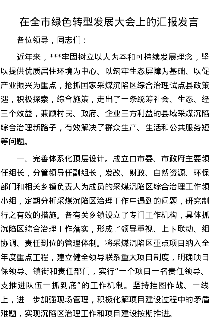 在全市绿色转型发展大会上的汇报发言