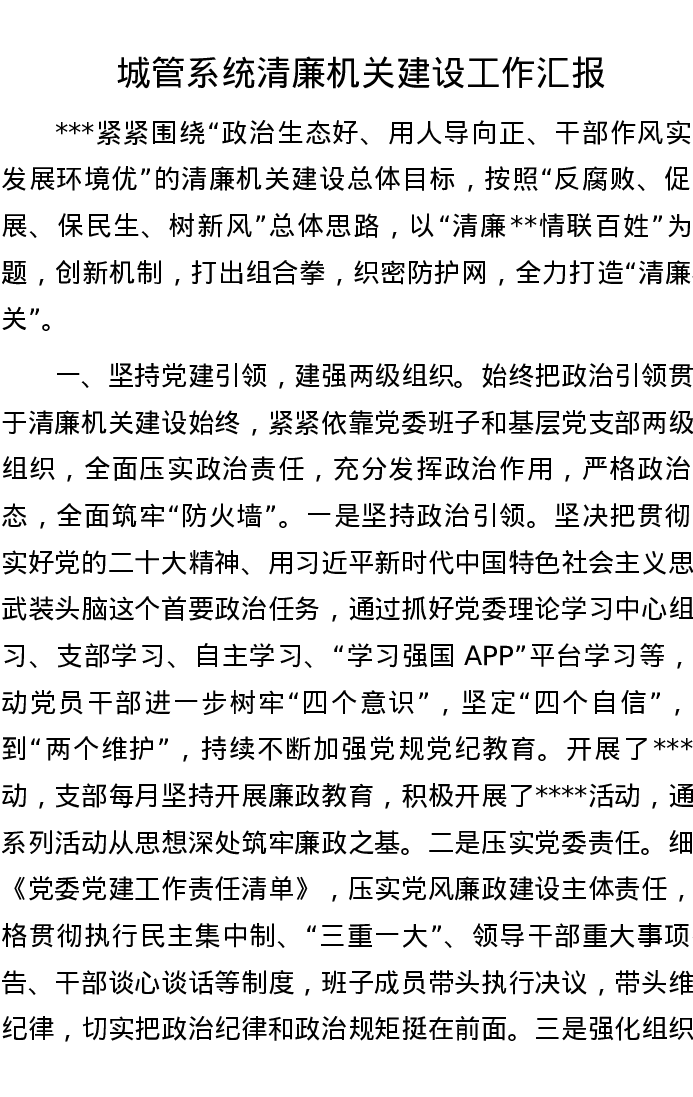 城管系统清廉机关建设工作汇报