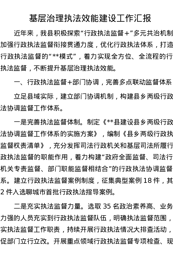 基层治理执法效能建设工作汇报
