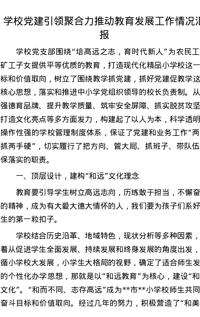 学校党建引领聚合力推动教育发展工作情况汇报