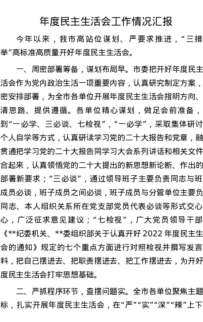 年度民主生活会工作情况汇报