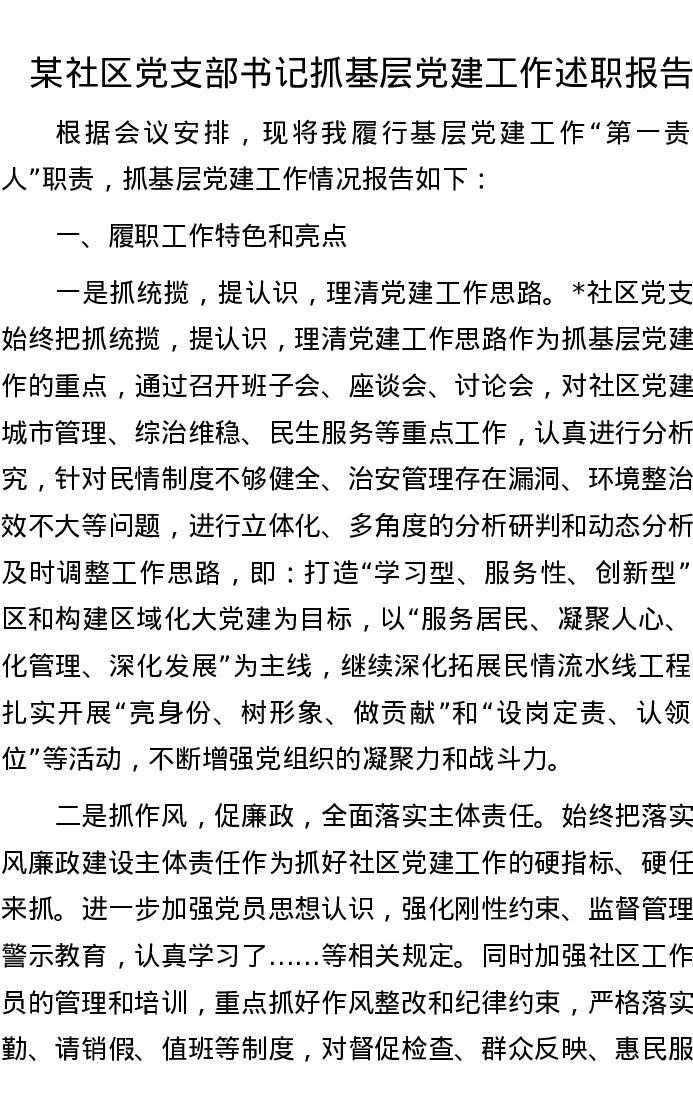 某社区党支部书记抓基层党建工作述职报告