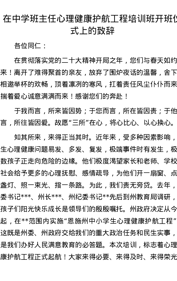 在中学班主任心理健康护航工程培训班开班仪式上的致辞