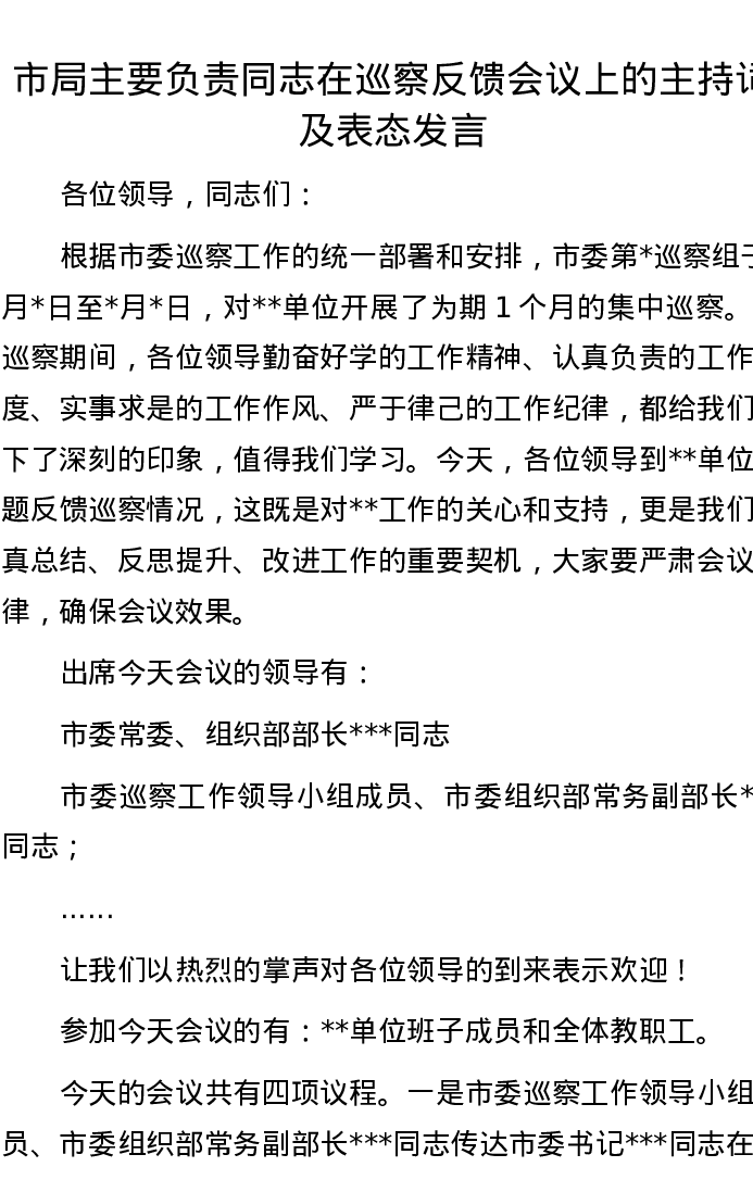 市局主要负责同志在巡察反馈会议上的主持词及表态发言