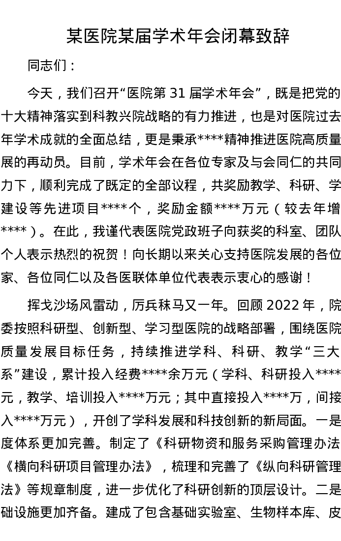 某医院某届学术年会闭幕致辞