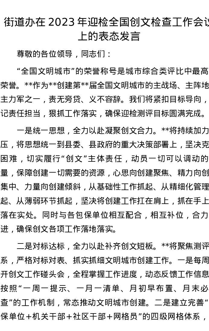 街道办在2023年迎检全国创文检查工作会议上的表态发言