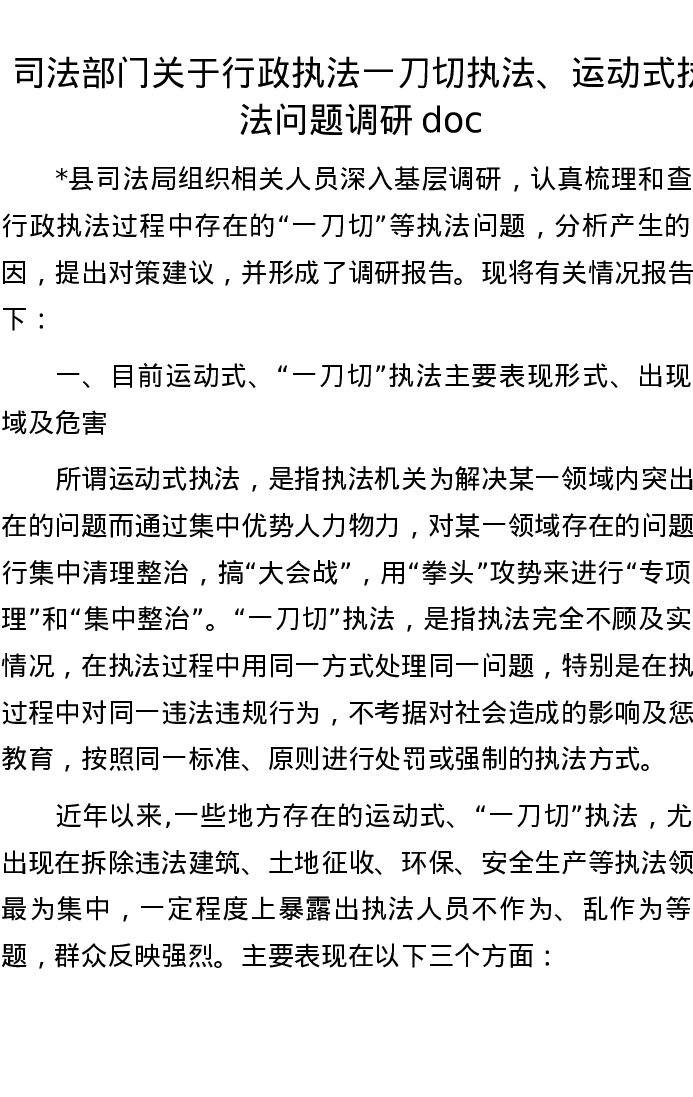 司法部门关于行政执法一刀切执法、运动式执法问题调研doc