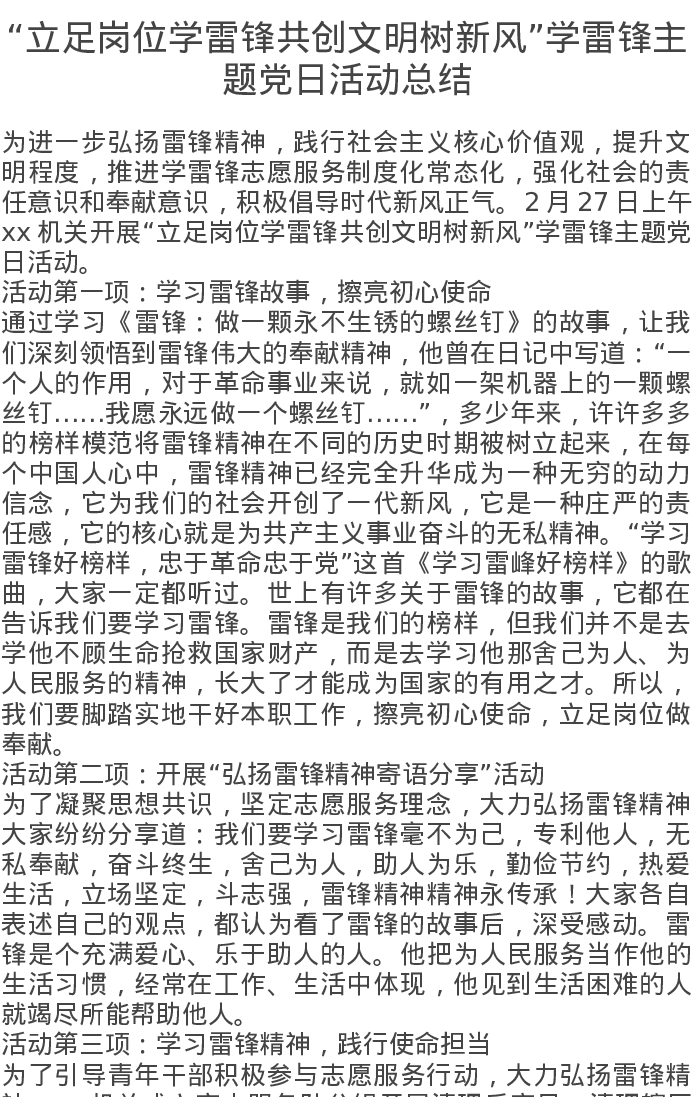 “立足岗位学雷锋共创文明树新风”学雷锋主题党日活动总结
