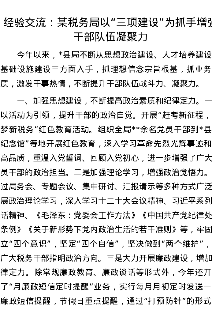 经验交流:某税务局以“三项建设”为抓手增强干部队伍凝聚力