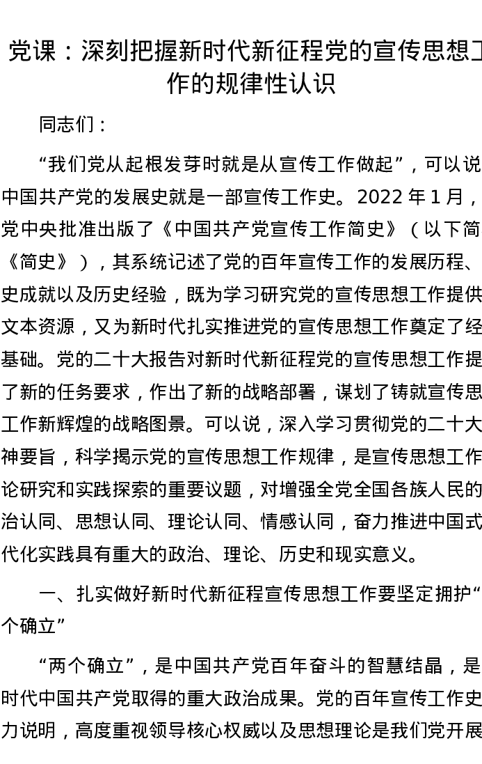 党课:深刻把握新时代新征程党的宣传思想工作的规律性认识