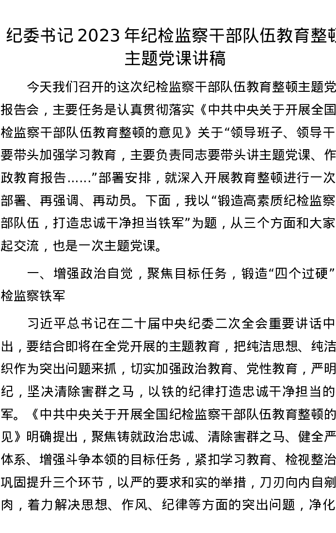 纪委书记2023年纪检监察干部队伍教育整顿主题党课讲稿