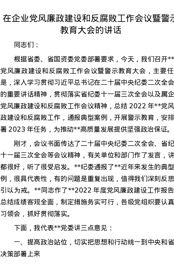 在企业党风廉政建设和反腐败工作会议暨警示教育大会的讲话