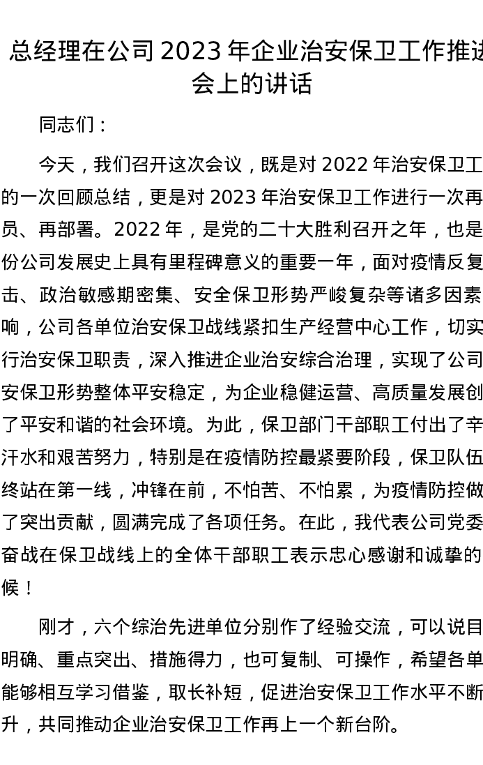 总经理在公司2023年企业治安保卫工作推进会上的讲话
