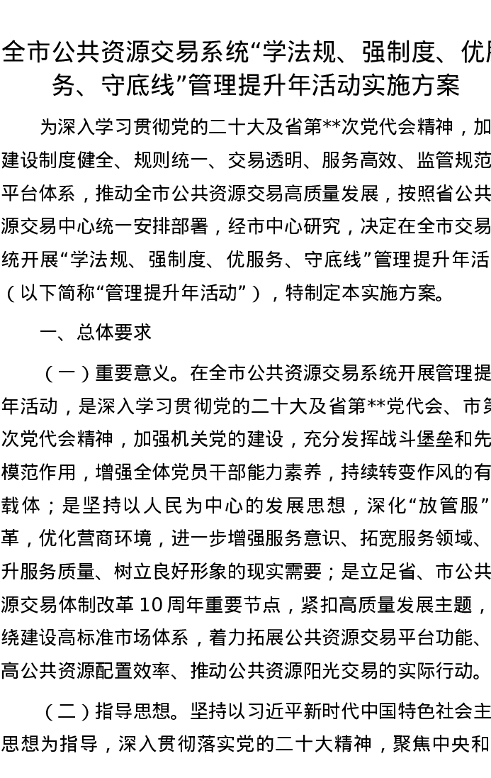 全市公共资源交易系统“学法规、强制度、优服务、守底线”管理提升年活动实施方案