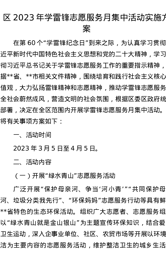 区2023年学雷锋志愿服务月集中活动实施方案