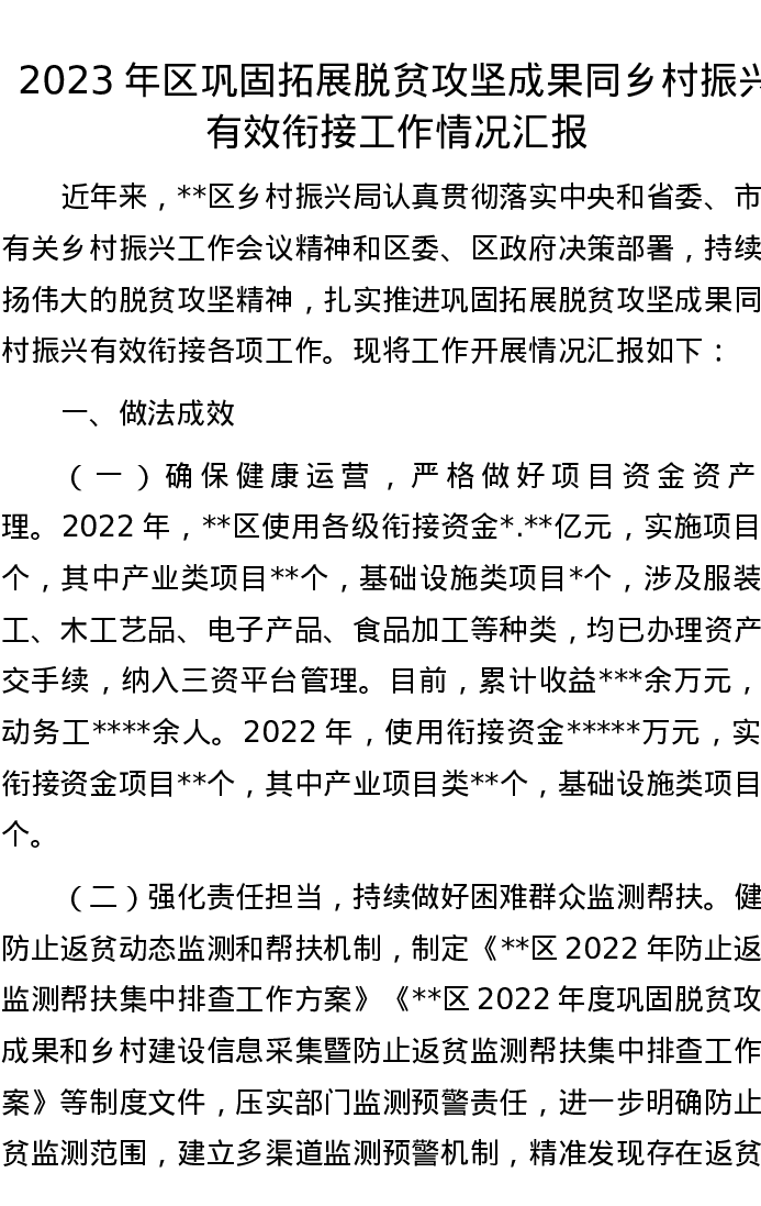 2023年区巩固拓展脱贫攻坚成果同乡村振兴有效衔接工作情况汇报