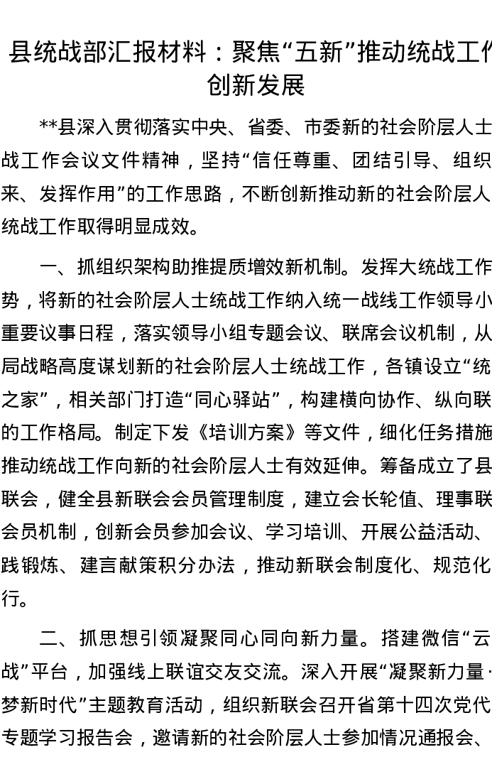 县统战部汇报材料:聚焦“五新”推动统战工作创新发展