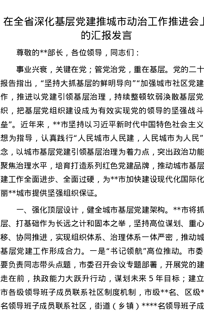 在全省深化基层党建推城市动治工作推进会上的汇报发言