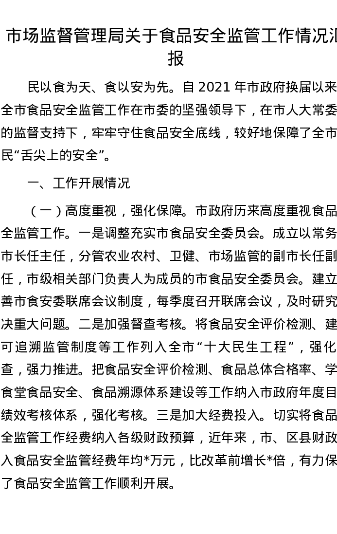 市场监督管理局关于食品安全监管工作情况汇报