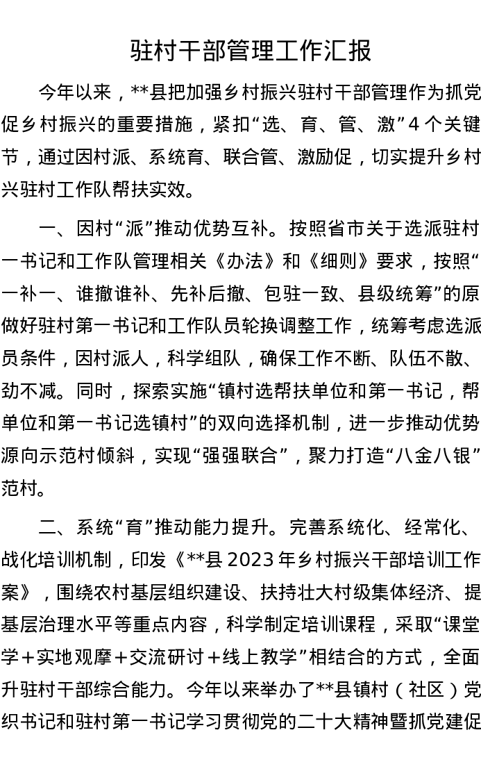 驻村干部管理工作汇报