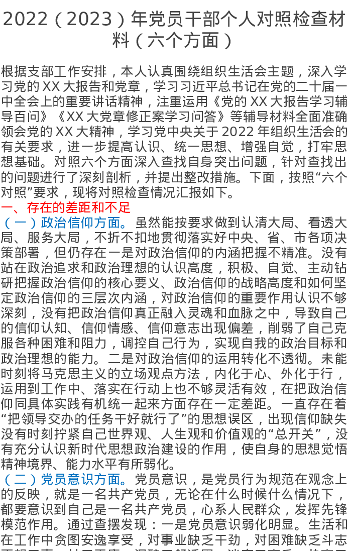 2022(2023)年党员干部个人对照检查材料(六个方面)