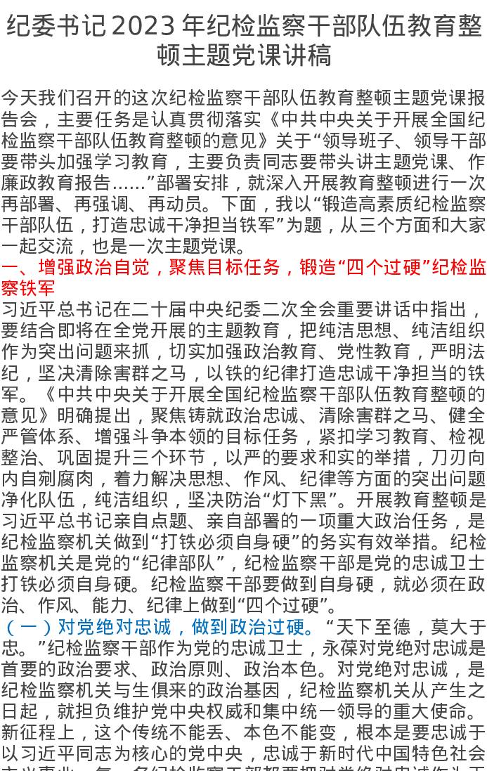 纪委书记2023年纪检监察干部队伍教育整顿主题党课讲稿