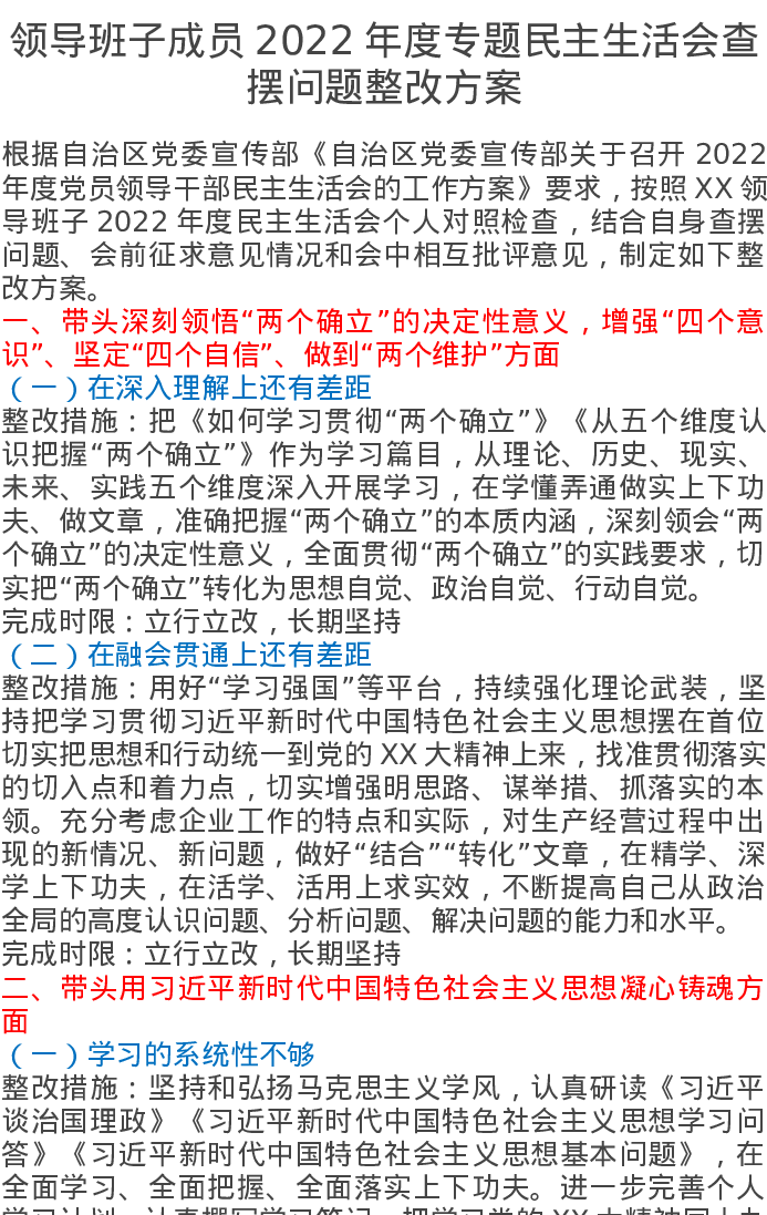 领导班子成员2022年度专题民主生活会查摆问题整改方案
