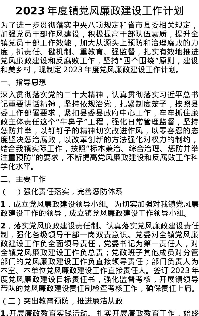 2023年度镇党风廉政建设工作计划