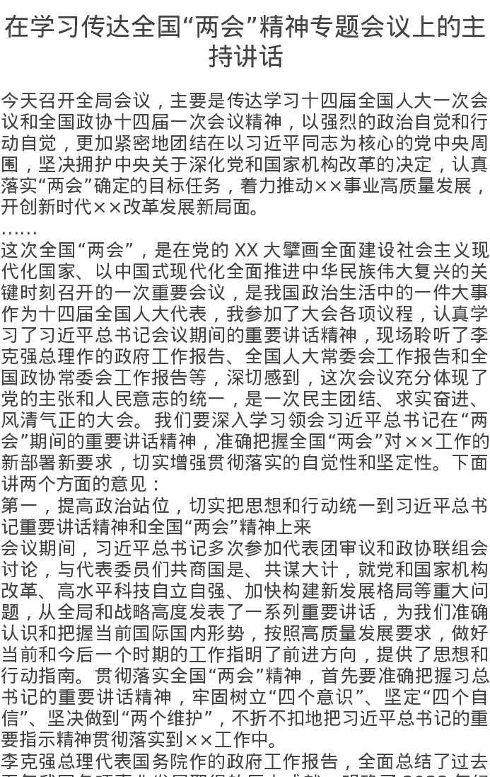 在学习传达全国“两会”精神专题会议上的主持讲话