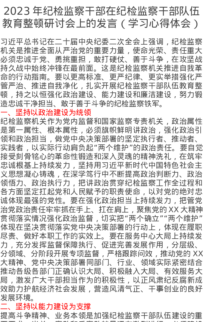 2023年纪检监察干部在纪检监察干部队伍教育整顿研讨会上的发言(学习心得体会)