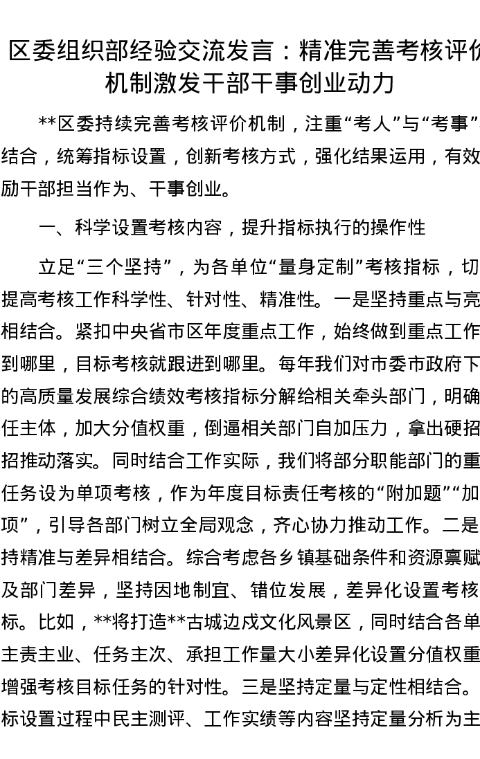区委组织部经验交流发言:精准完善考核评价机制激发干部干事创业动力