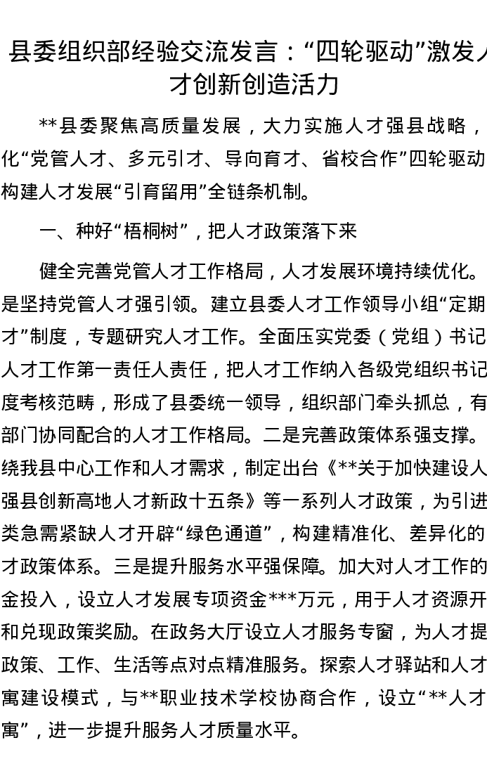 县委组织部经验交流发言:“四轮驱动”激发人才创新创造活力