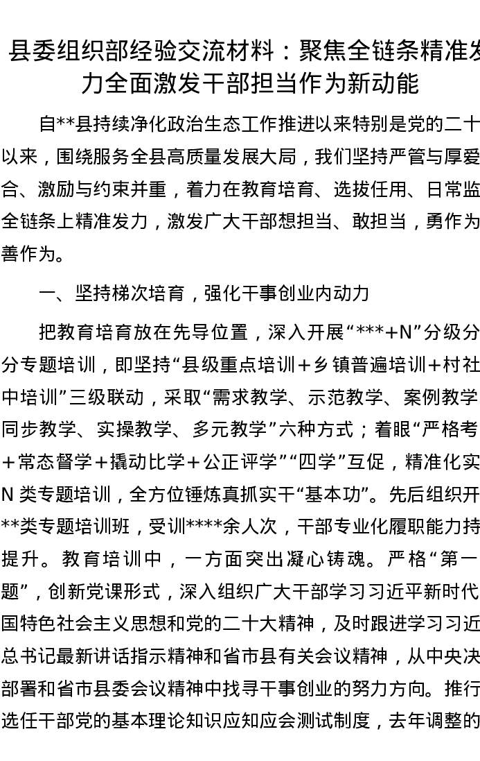 县委组织部经验交流材料:聚焦全链条精准发力全面激发干部担当作为新动能