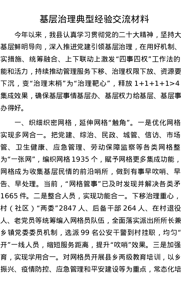 基层治理典型经验交流材料