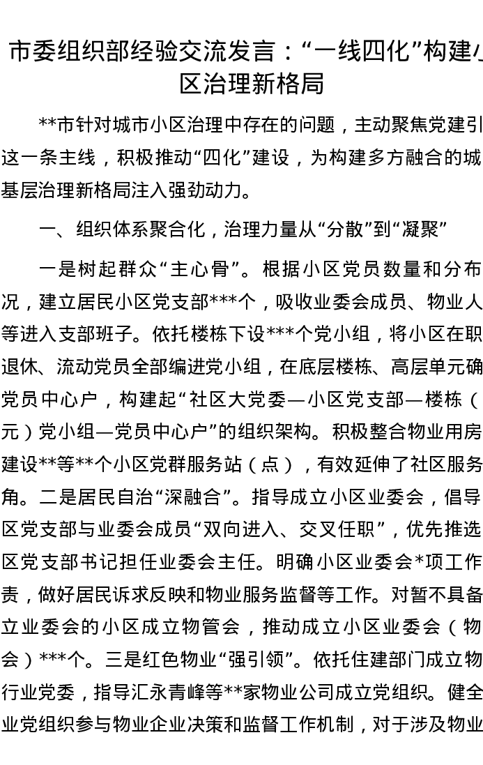 市委组织部经验交流发言:“一线四化”构建小区治理新格局
