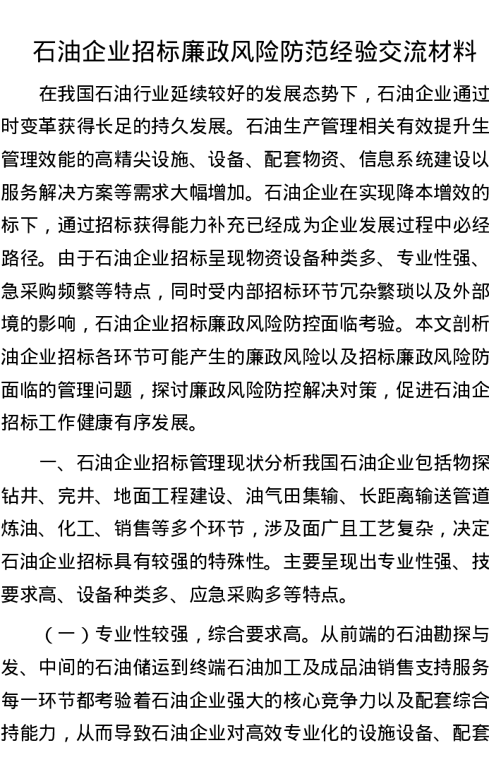 石油企业招标廉政风险防范经验交流材料