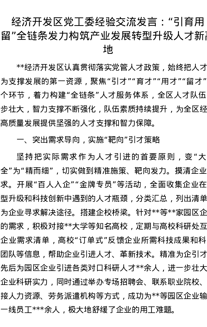 经济开发区党工委经验交流发言:“引育用留”全链条发力构筑产业发展转型升级人才新高地